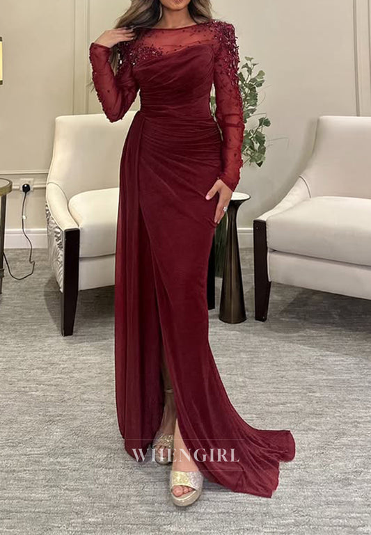 Unique Bateau Beads Pleats Long Sleeves Burgundy Mermaid Formal Evening Dress with Slit