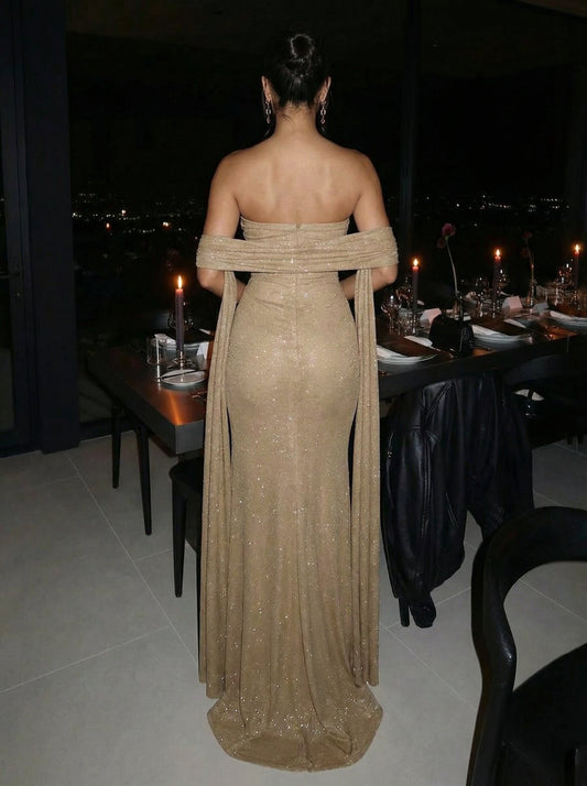Glitter Stretch Jersey Strapless Ruched Sheath Maxi Evening Dresses with Scarf