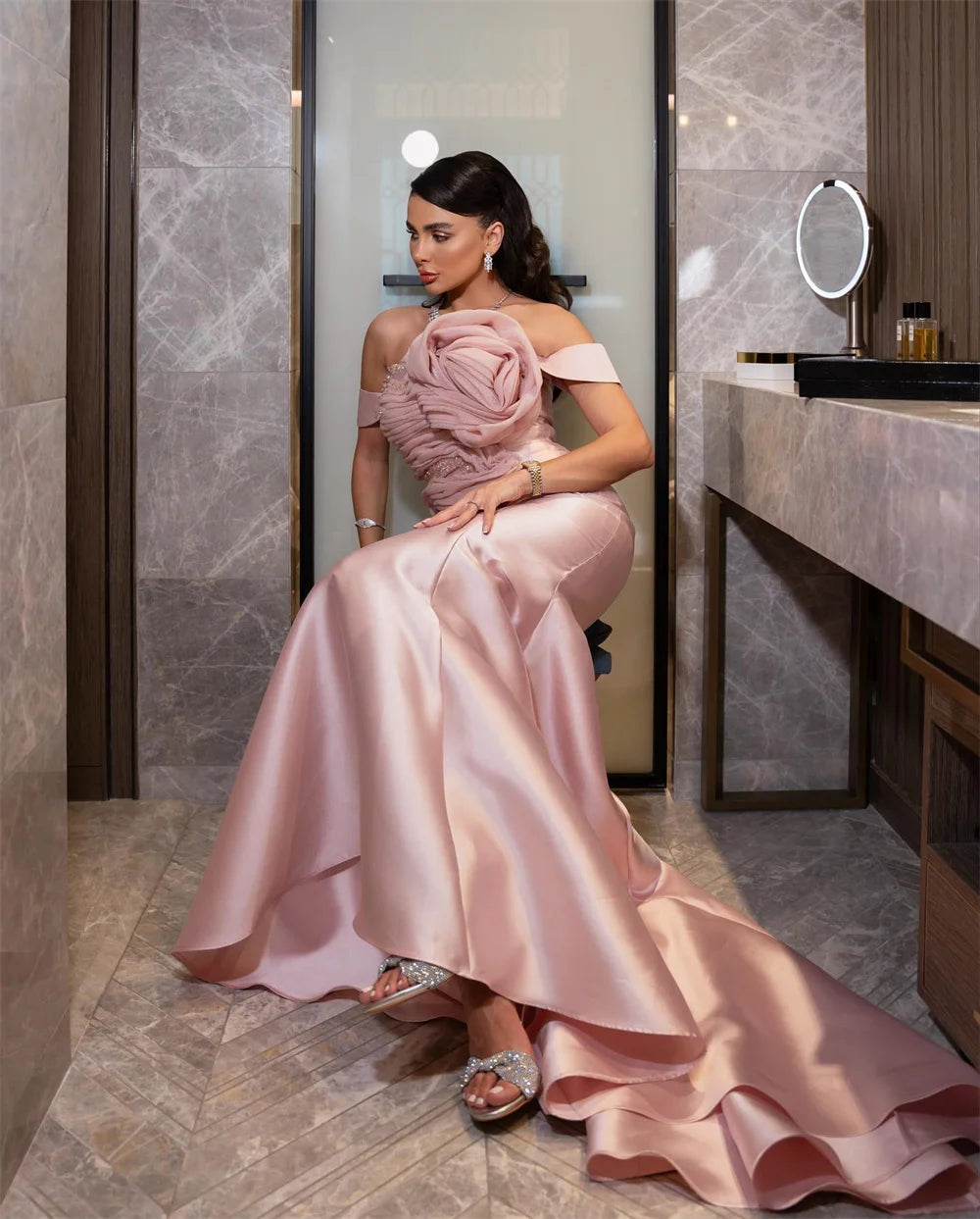 Customized Pink Off Shoulder 3D Flower Prom Dresses Sleeveless Mermaid Evening Dress