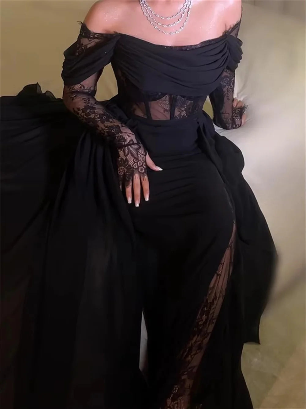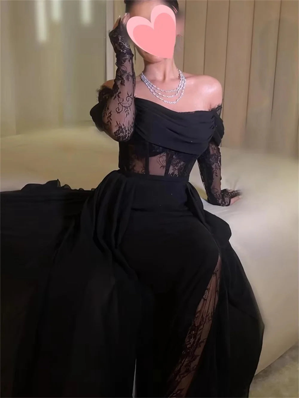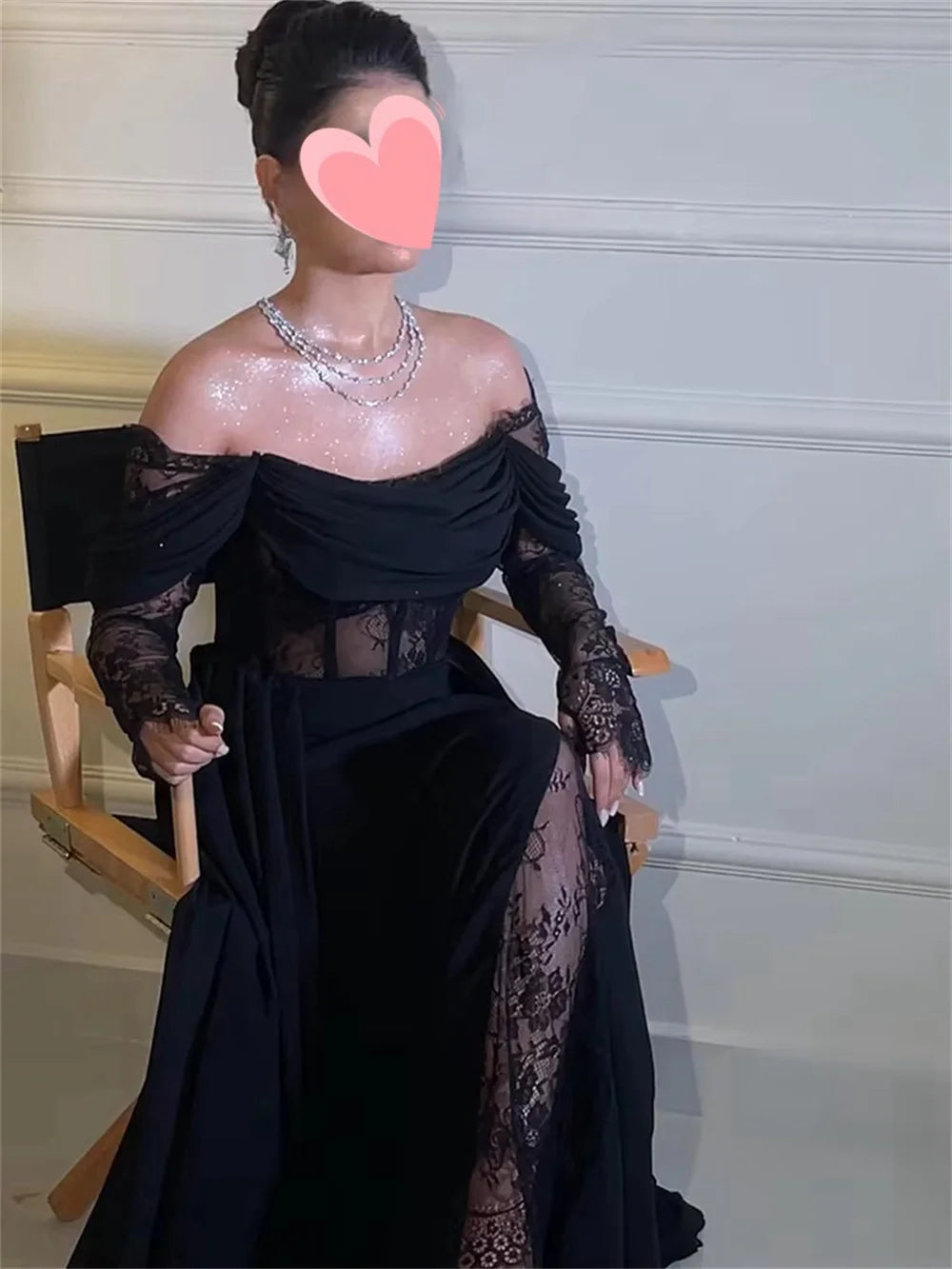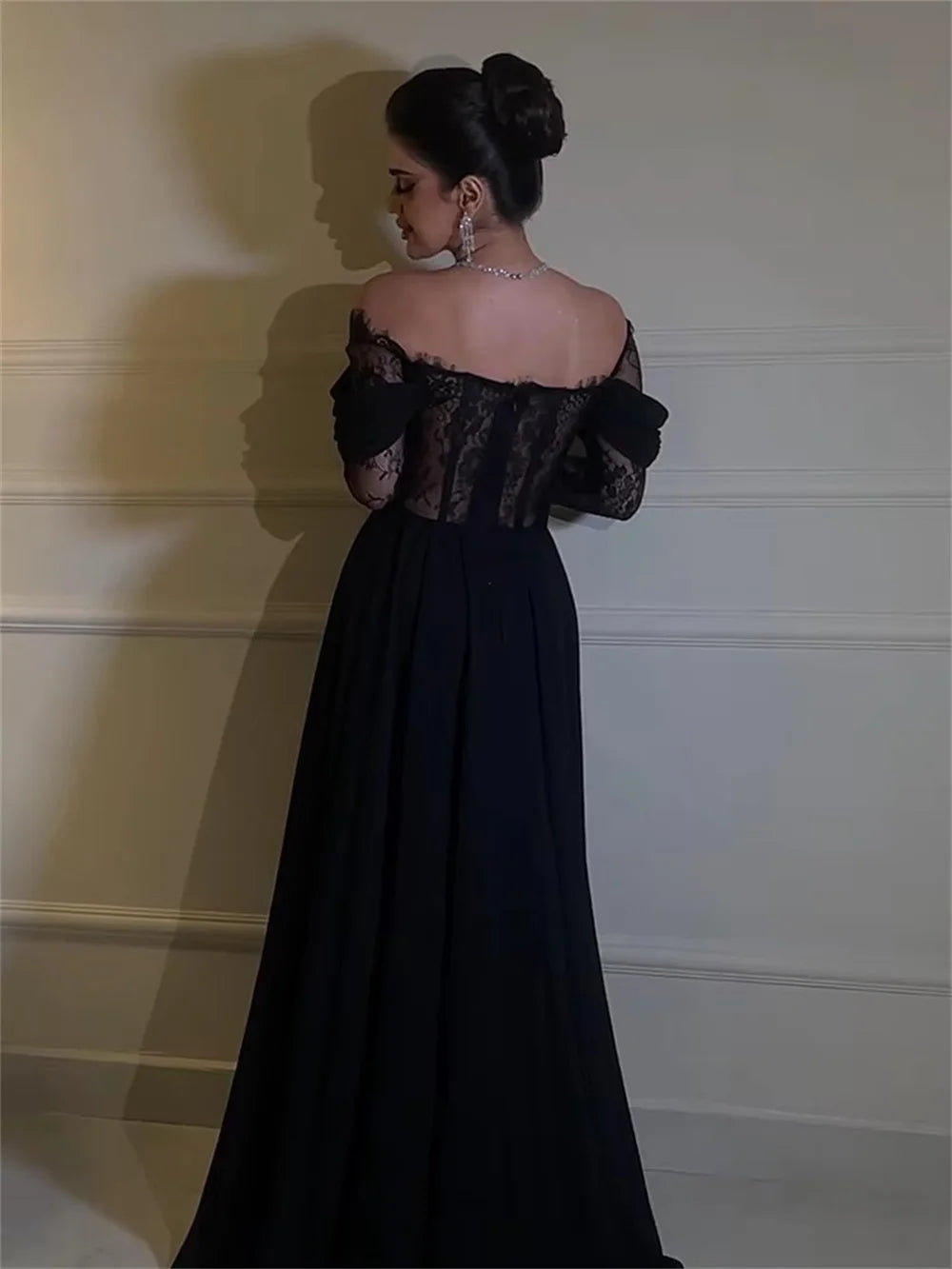 Off Shoulder Lace Long Sleeves Black Formal Evening Dress