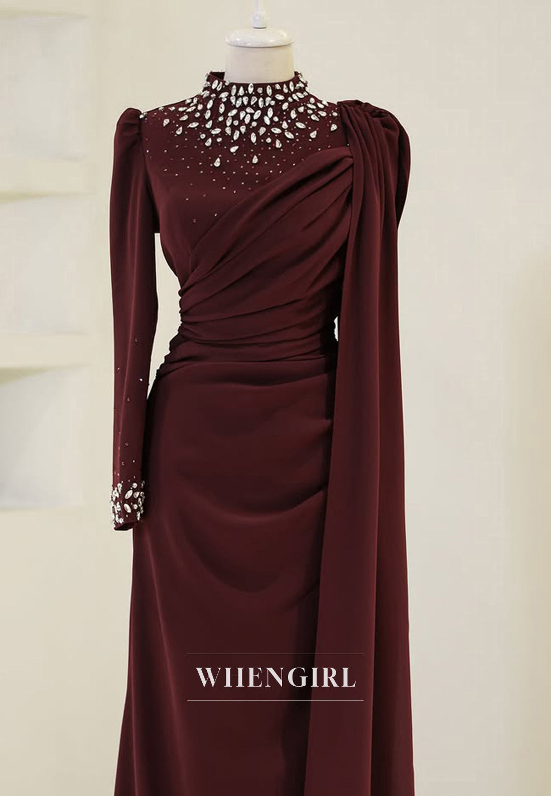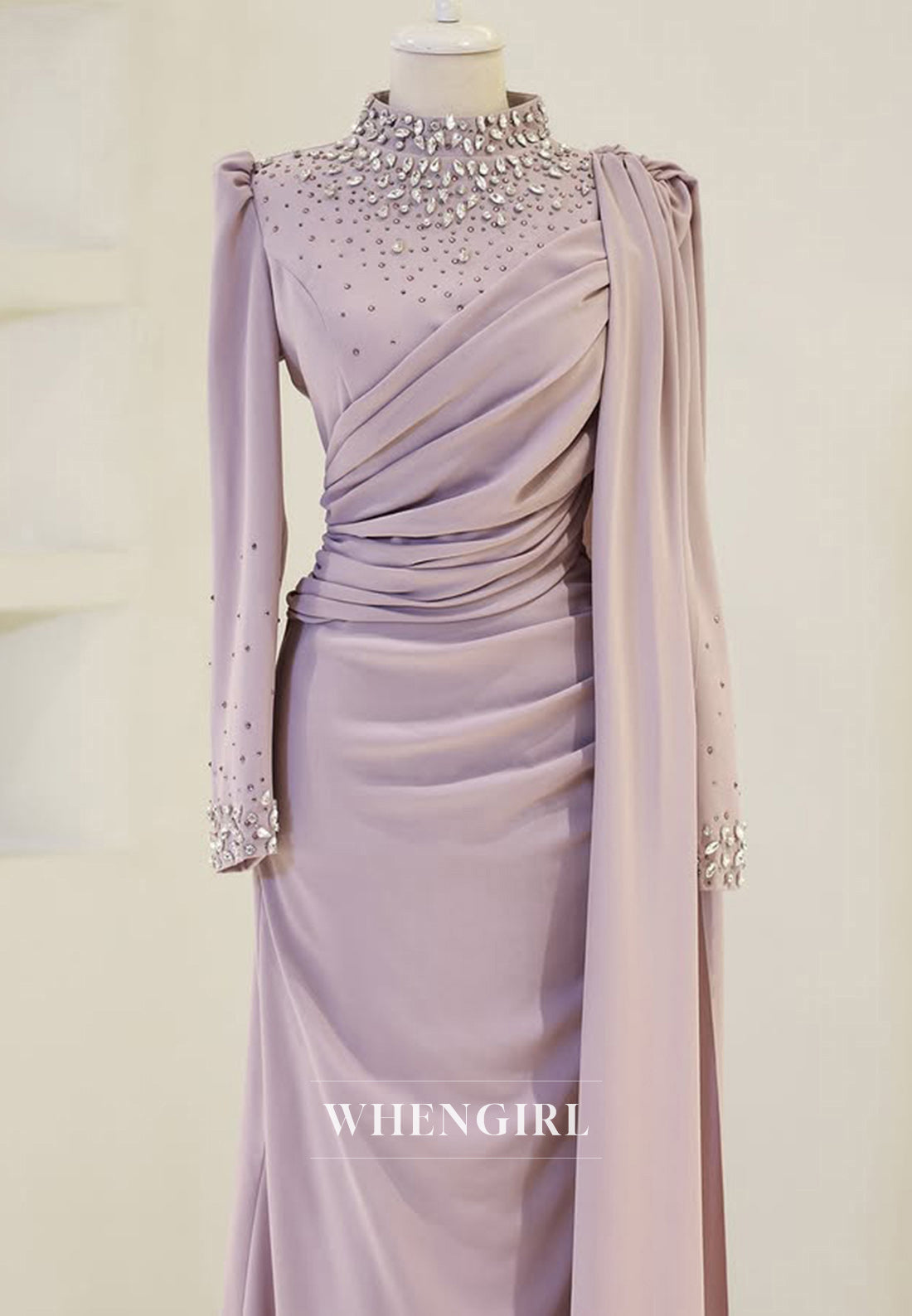 Elegant High Neck Long Sleeves Pleats Satin Formal Prom Dress with Beaded
