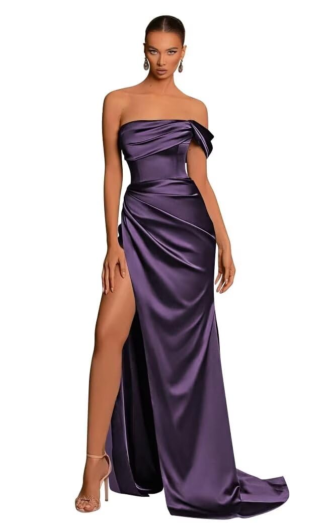 Shoulder Sleeveless Side Slit Pleats Satin Party Dress with Train Bridesmaid Dress