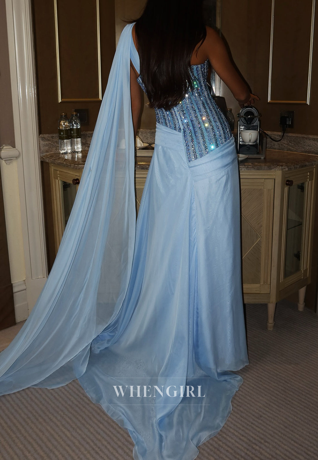 Blue One Shoudler Sweetheart Sleeveless Side Train Beaded Evening Dress