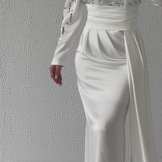 Elevate your formal look with this white high-neck evening dress featuring long sleeves and a pleated column silhouette. The flattering design is enhanced by a striking side train, adding graceful movement and refined drama. Perfect for sophisticated occasions, this dress embodies timeless elegance.