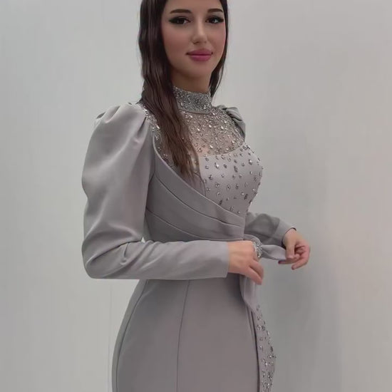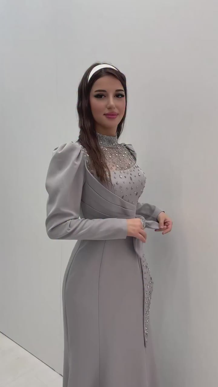 Make a bold statement in this gray mermaid evening dress featuring sleek long sleeves and a high neckline. The daring bowknot detail adds an unexpected edge, while the figure-hugging silhouette dramatically flares at the hem, highlighting your curves with confidence. Perfect for formal events where elegance meets audacity.