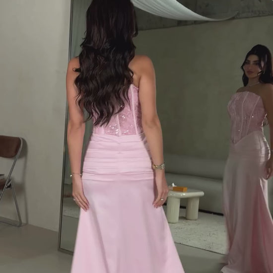 Embrace timeless glamour in this exquisite pink evening gown that celebrates your elegance. The tube top design offers a chic, modern silhouette while the sleeveless cut keeps the look fresh and refined. Delicate beading embellishes the bodice, adding sparkle and dimension that catches the light beautifully. Pleated detailing creates texture and movement, enhancing the sheath silhouette for a flattering, sophisticated fit. The back zipper ensures easy wear while maintaining a seamless front appearance. Perfect for formal galas, weddings, and special occasions, this gown helps you radiate confidence and poise. The soft pink tone complements all skin tones, making you feel absolutely stunning from the moment you slip it on.