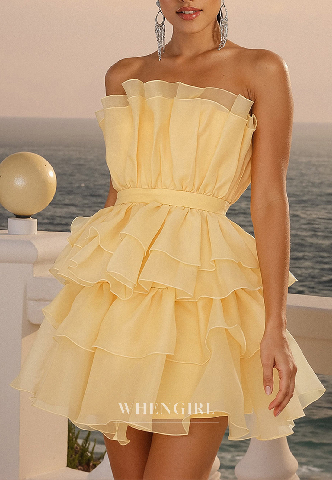 Yellow Tiered Ruffles A-Line Chiffon Sleeveless Strapless Homecoming Dress