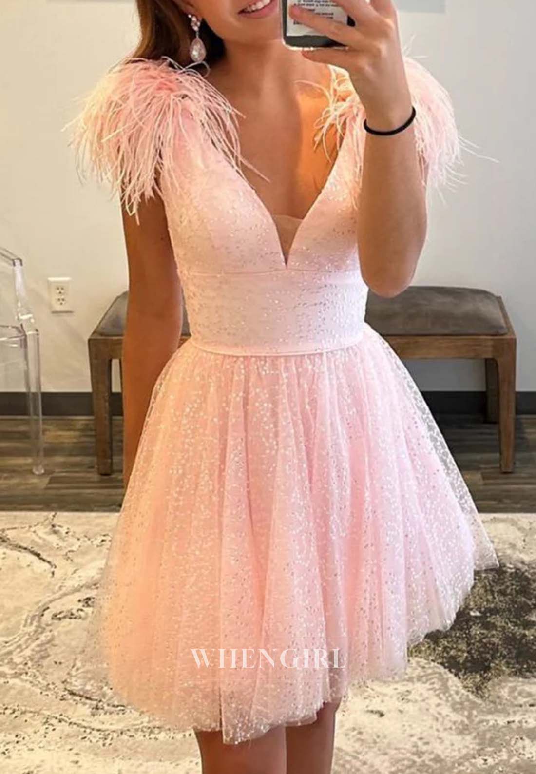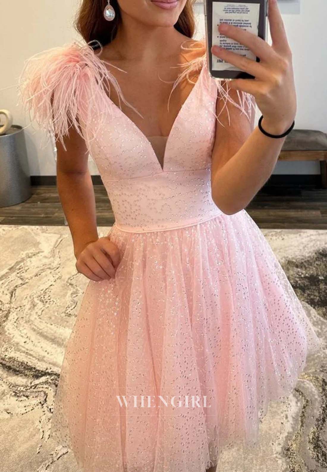 Blush V Neck Feather Sleeveless A-Line Short Beads Homecoming Dress