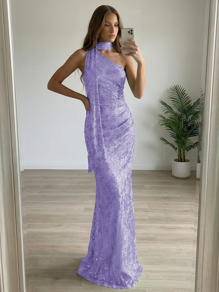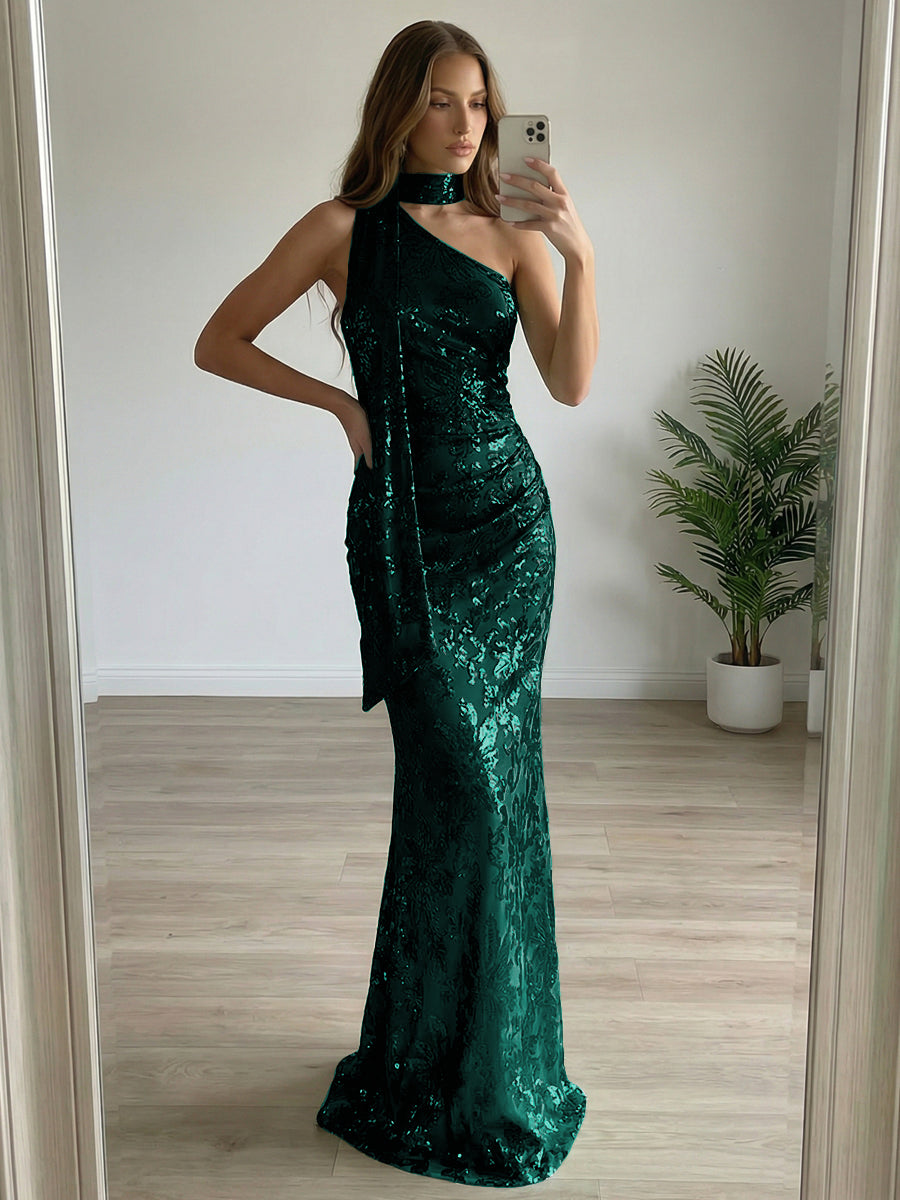 Floral Sequin One Shoulder Ruched Floor-Length Evening Dresses with Scarf