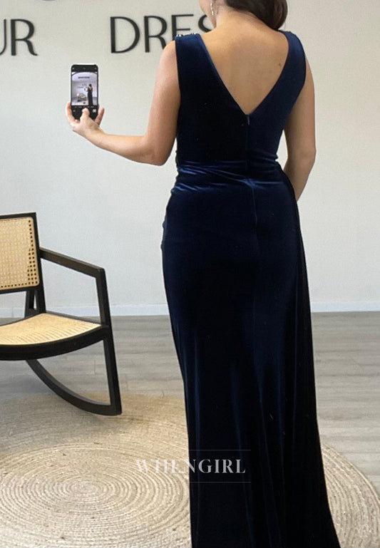 V Neck Low Back Mermaid Evening Dress Rhinestone Side Slit Waist Cut Out Formal Gown