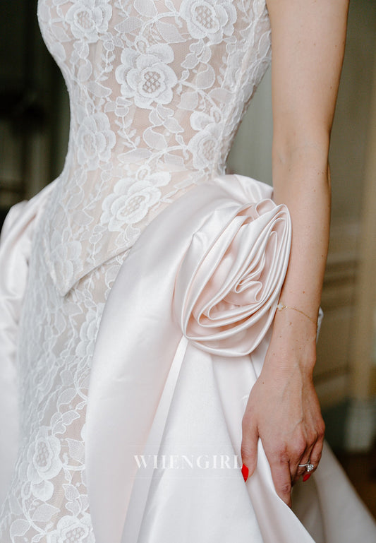 Sheath Appliqued Lace Sleeveless 3D Flower Ruched Chapel Train Wedding Gown