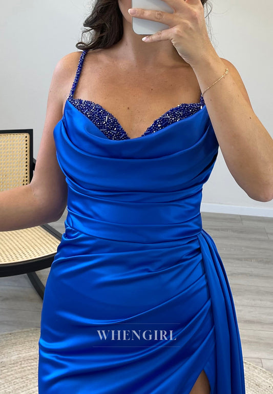 Royal Blue Side Slit Beade Evening Gown Spaghetti Straps Sweetheart Mermaid Formal Dress