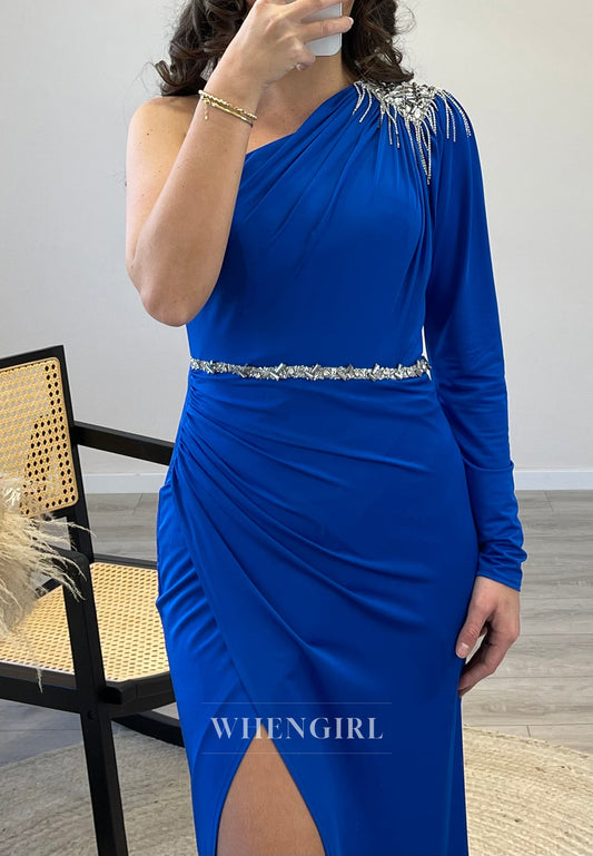 Royal Blue Pleated Side Slit Single Long Sleeve Rhinestone Tassel Mermaid Formal Evening Dress