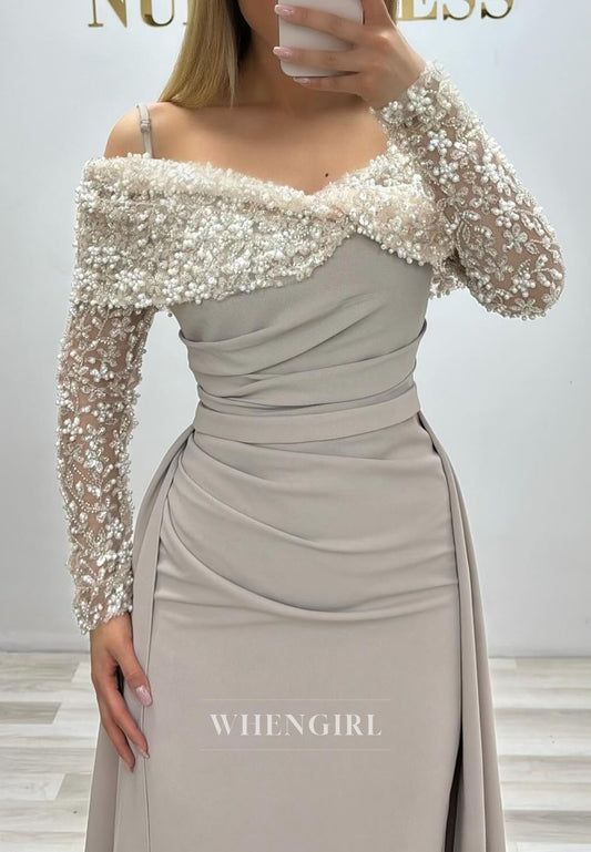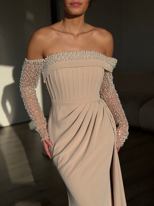 Beige Off Shoulder Long Beaded Sleeves Ruched Sheath Evening Formal Dress
