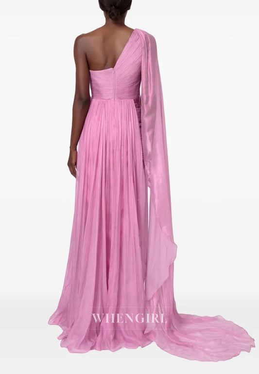 Pink Pleated Beaded One Shoulder A-Line Floor Length Evenning Dress