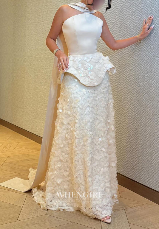Off White Strapless Sleeveless Ruffle Column Evening Dress with Scarf