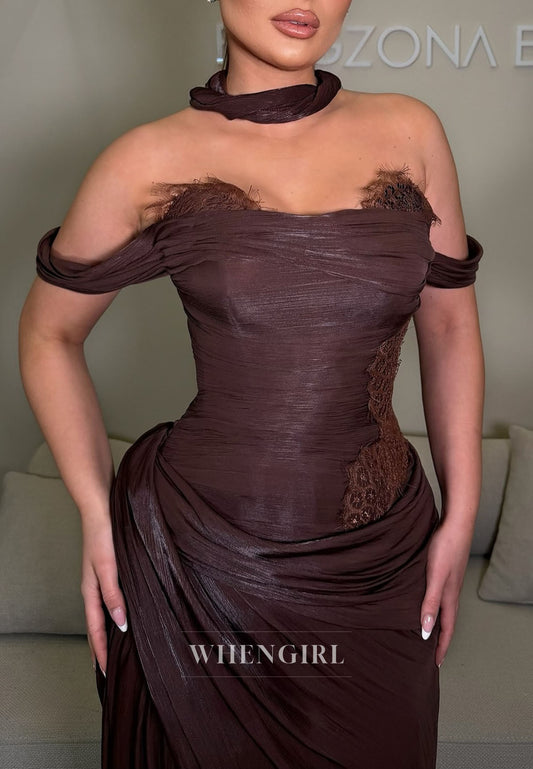 Chocolate Off Shoulder Sleeveless Ruched Sheath Evening Formal Gown