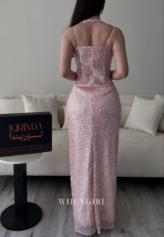 Pink Halter Ruched Beaded Side Slit Sleeveless Evening Dress