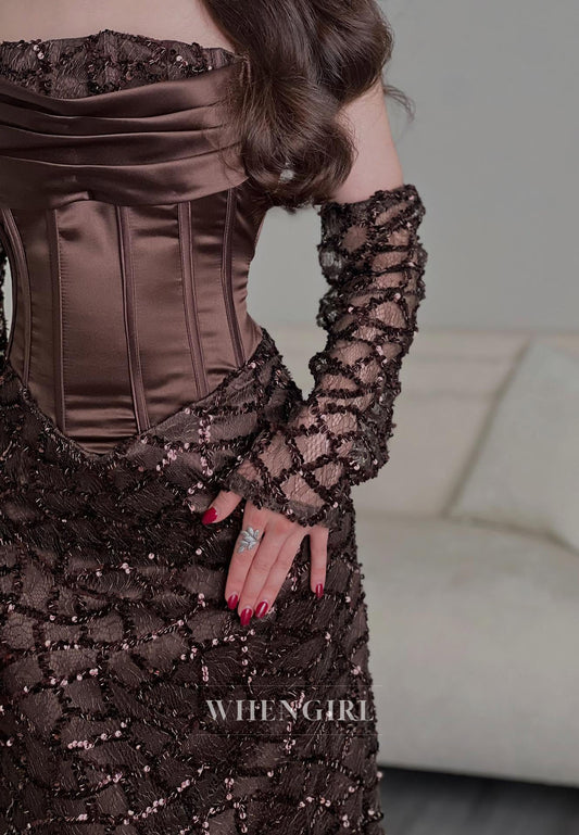 Dark Brown Off Shoulder Long Sleeves Beaded Column Floor Length Evening Gown