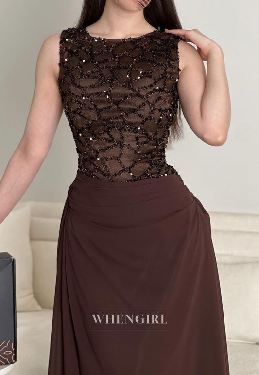 Chocolate Bateau Neck Sleeveless Beaded Column Ankle Length Evening Dress