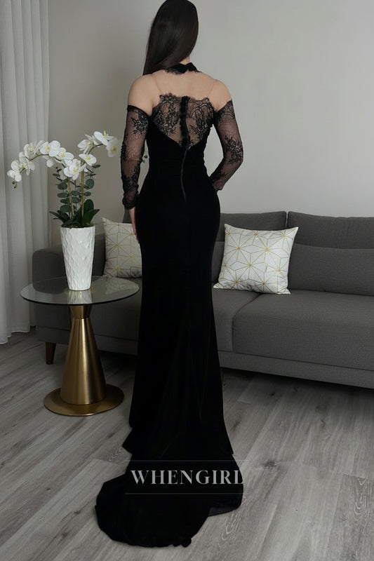 Sheath Long Sleeves Lace Top High Neck Evening Dress with Scarf