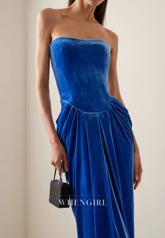 Royal Blue Velvet Tube Top Sleeveless Ruched Evening Formal Gown
