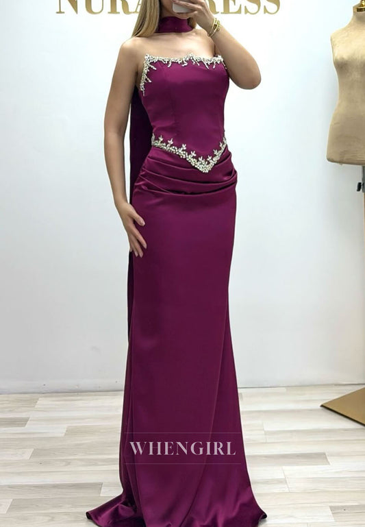 Sheath Beaded Sleeveless Beaded Ruched Evening Dress with Scarf