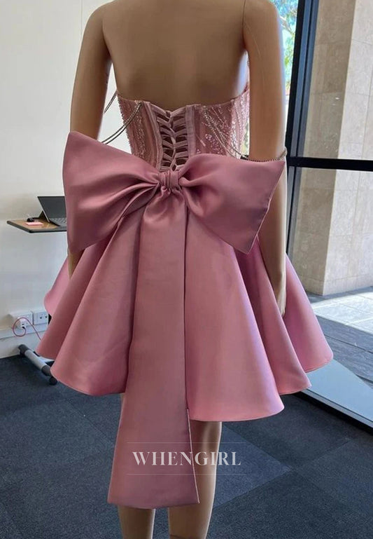 Pink A-Line Off Shoulder Beaded Lace Up Sleeveless Bowknot Short Homecoming Dress