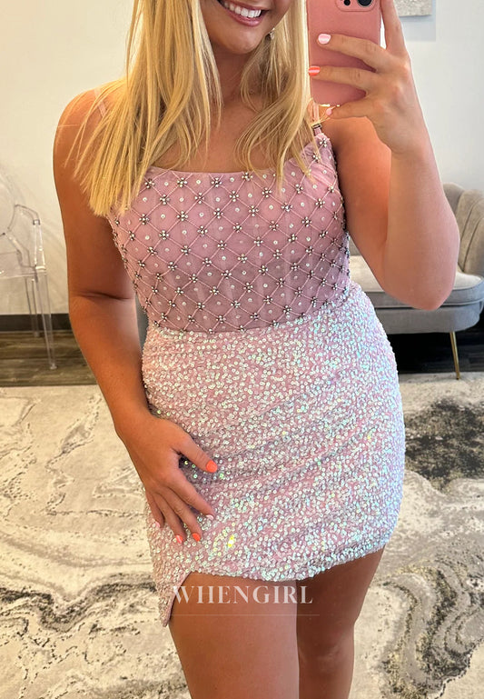 Sheath Sleeveless Bateau Neck Sequins Back Zipper Beaded Short Homecoming Dress