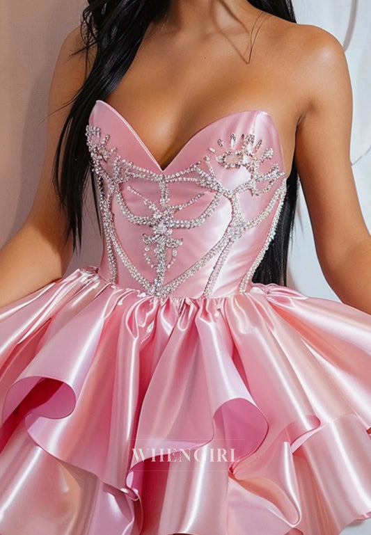Sparkly Pink Satin Ruffles Sweetheart Beaded A-Line Short Homecoming Dress