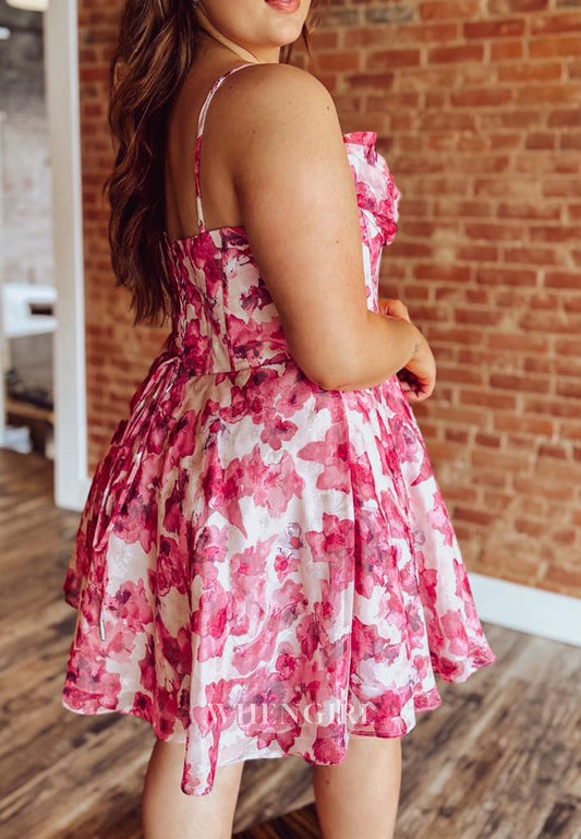 A-Line Floral Sweetheart Spaghetti Straps Pleated Lace Up Short Homecoming Dress