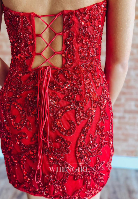Red Sheath V Neck Sleeveless Lace Up Beaded Short Homecoming Dress