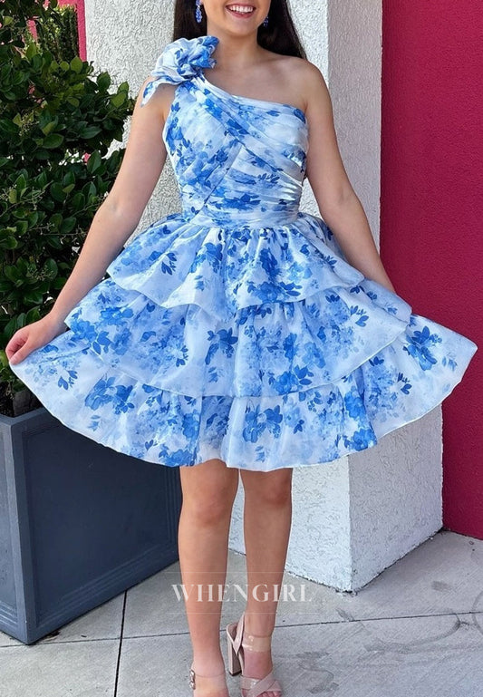 One Shoulder Blue A-Line Sleeveless Pleated Floral Short Homecoming Dress