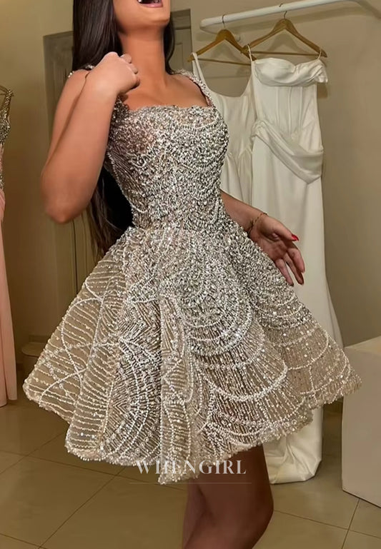 A-Line Full Rhinestone Beading Square Neck Sleeveless Lace Up Short Homecoming Dress