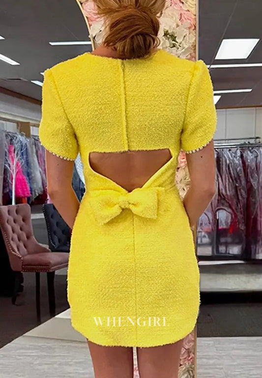 Daffodil Bateau Neck Beaded Short Sleeves Bow Cut Out Sheath Short Homecoming Dress