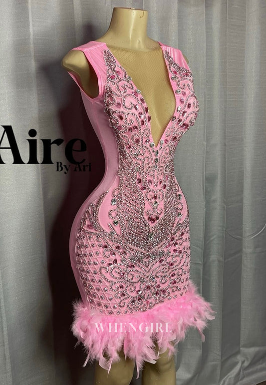 Pink Luxury V Neck Sleeveless Beaded Rhinestones Feather Back Zipper Sheath Short Homecoming Dress