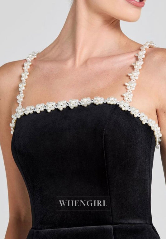 Black Velvet Sleeveless Pearls Beading Straps Sheath Homecoming Dress