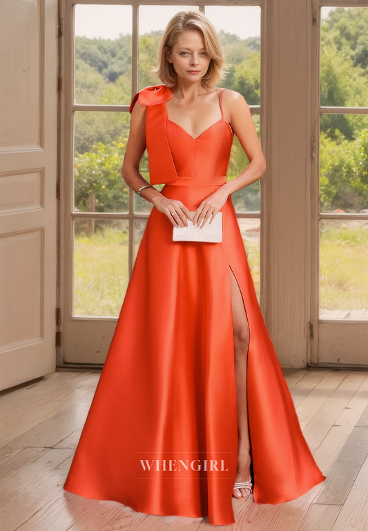 Chic & Modern Sweetheart A-Line Spaghetti Straps Slit Floor-Length Satin Mother of the Bride Dress with Bow