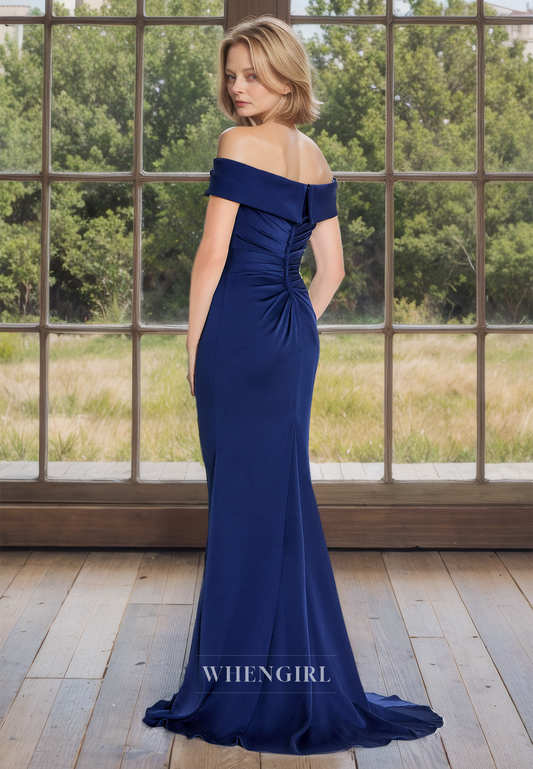Classic&Timeless Off-Shoulder Sheath High Slit Train Satin Cocktail Dress with Beads Mother of the Bride