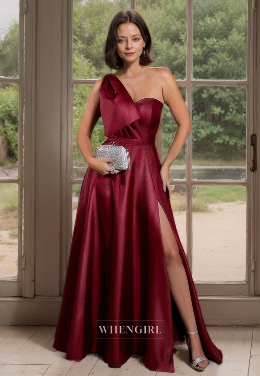 Classic & Simple One Shoulder A-Line Sleeveless Pleats Satin with Bow Mother of the Bride Dress