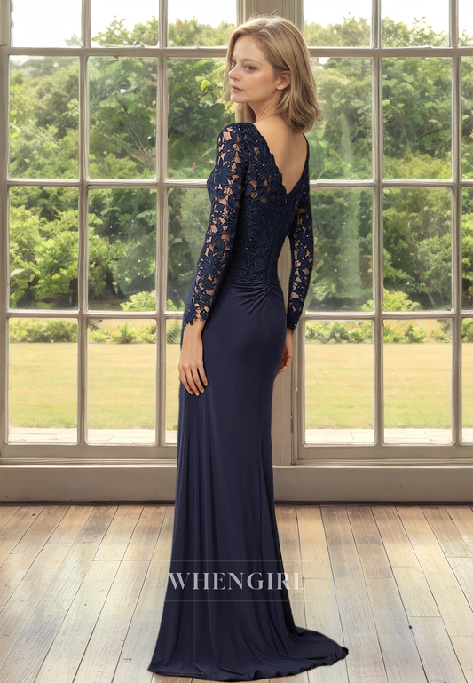 Elegant&Luxurious V-Neck Long Sleeves Sheath Appliques Lace Mother of the Bride Gowns with Pleats