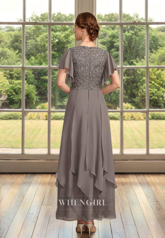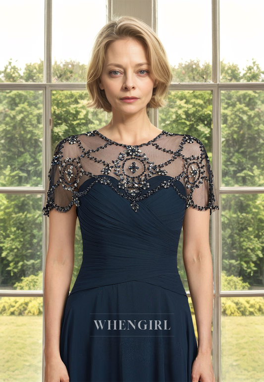 Sexy&Hot A-Line Short Sleeves Scoop Neck Pleated Lace Mother of the Bride Dress with Beads