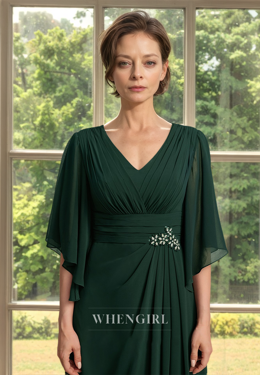 Chic&Modern Half Sleeves A-Line V-Neck Floor-Length Pleats Lace Cocktail Dress with Beads Mother of Bride