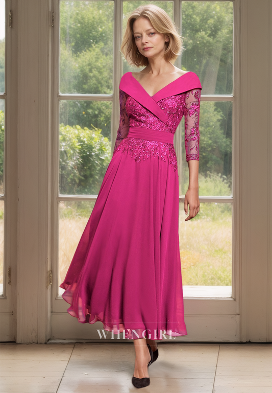 A-Line V-Neck Long Sleeves Pleated Appliques Lace Cocktail Dress with Beaded Mother of Bride Dress