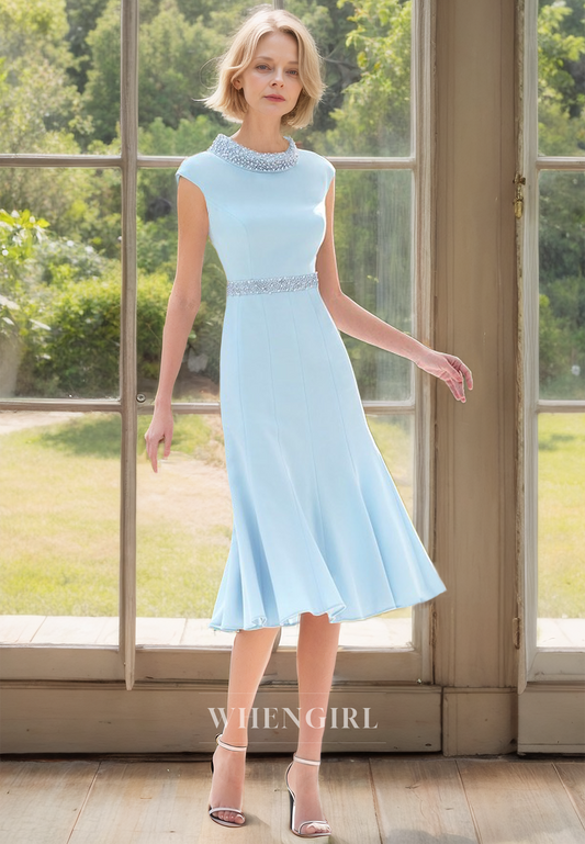 Square Neck Half Sleeves Sheath Knee-Length Appliques Satin Mother of Bride with Beads Cocktail Dress