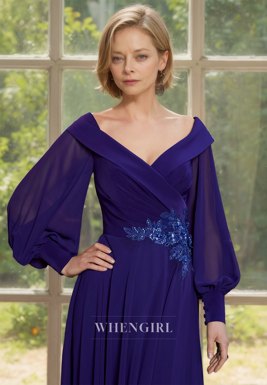 Elegant&Luxurious A-Line V-Neck Long Sleeves Chiffon Mother of Bride with Appliques Cocktail Dress