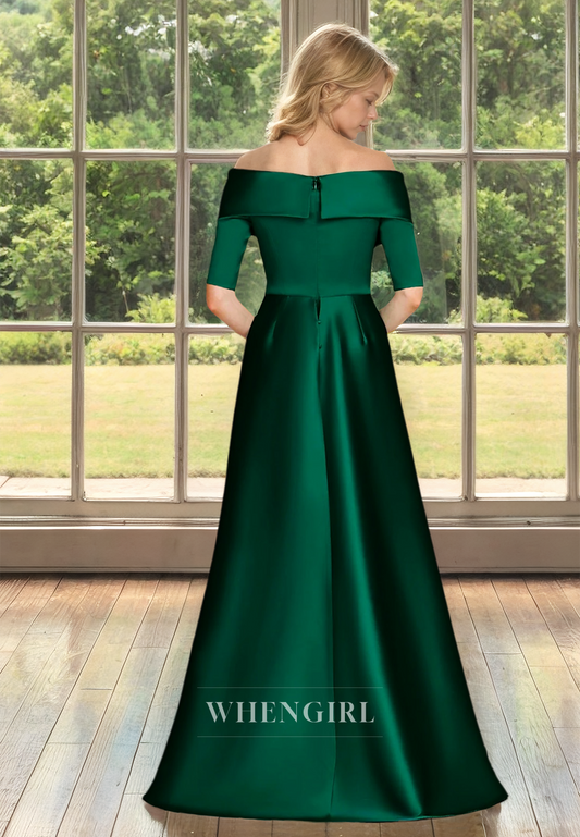 Off-Shoulder A-Line Half Sleeves Floor-Length Ruced Satin Cocktail Gowns Mother of Bride Dress