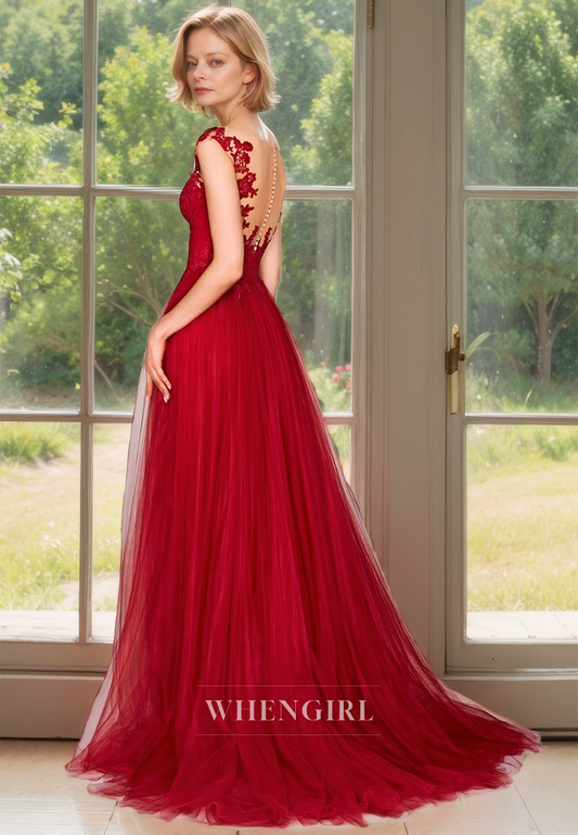 A-Line V-Neck Cap Sleeves High Split Train Pleats Lace Cocktail Dress with Appliques Mother of Bride