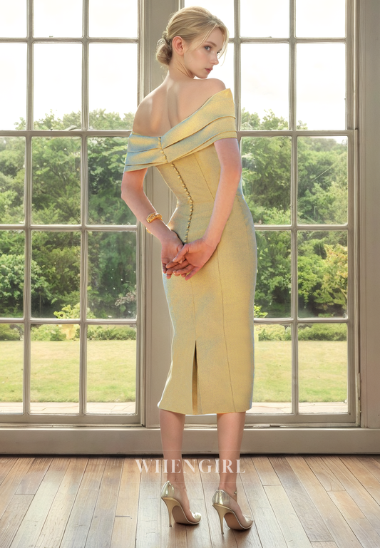Sheath Off Shoulder Sleeves Pleated Ruffles Back Zipper Buttons Mother of Bride Dress