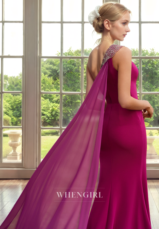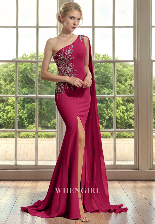 Mermaid One Shoulder Sleeveless Beaded Pleayed Mother of Bride Dress with Side Slit